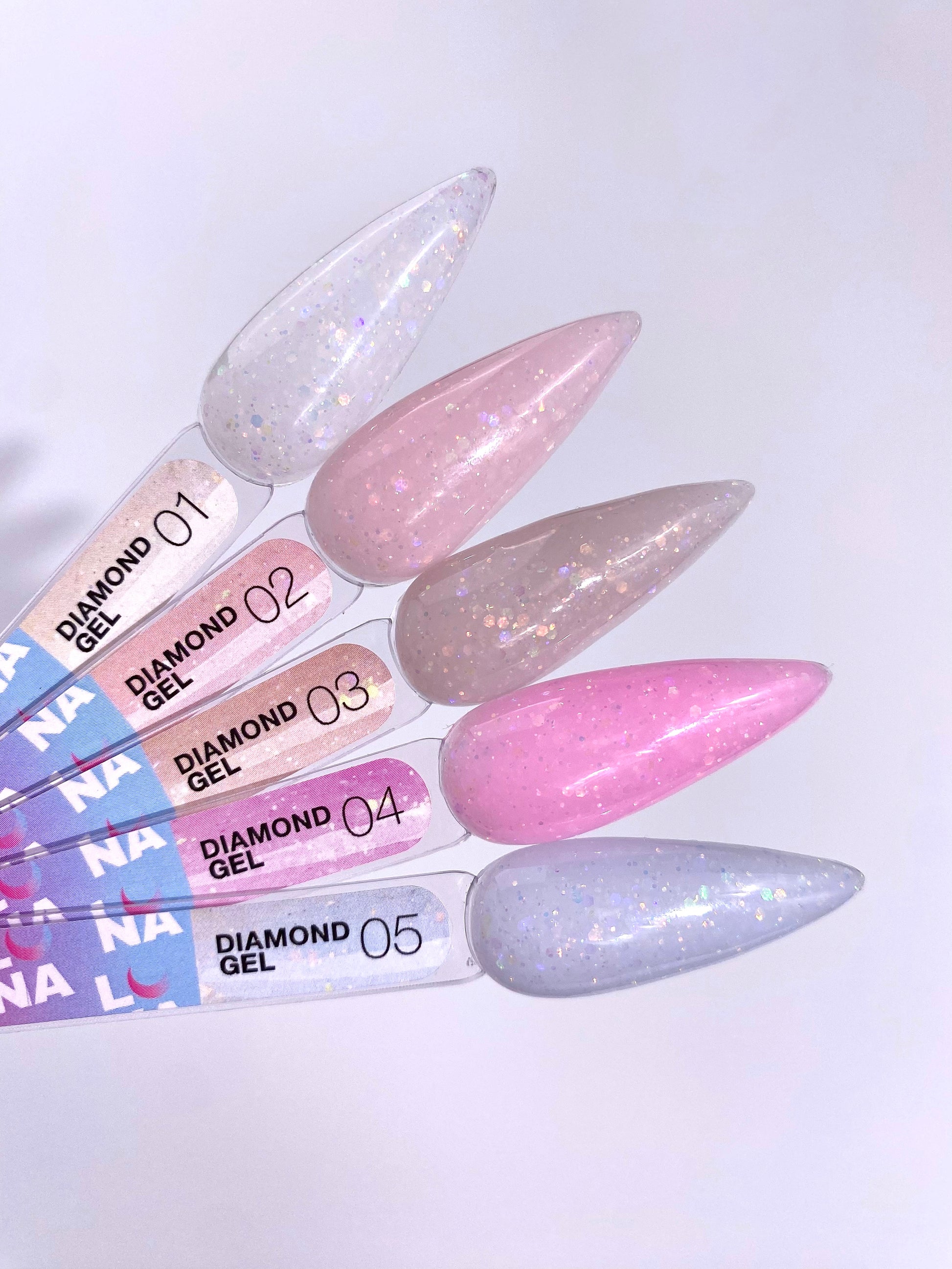 Das Diamond-Gel ist ein lichtaushärtendes Polymermaterial, das dank seiner hohen Festigkeit eine deutliche Verlängerung der Nagelplatte ermöglicht. Es enthält Photoinitiatoren, die den Polymerisationsprozess aktivieren, sobald das Material unter UV-Licht einer bestimmten Wellenlänge ausgehärtet wird.