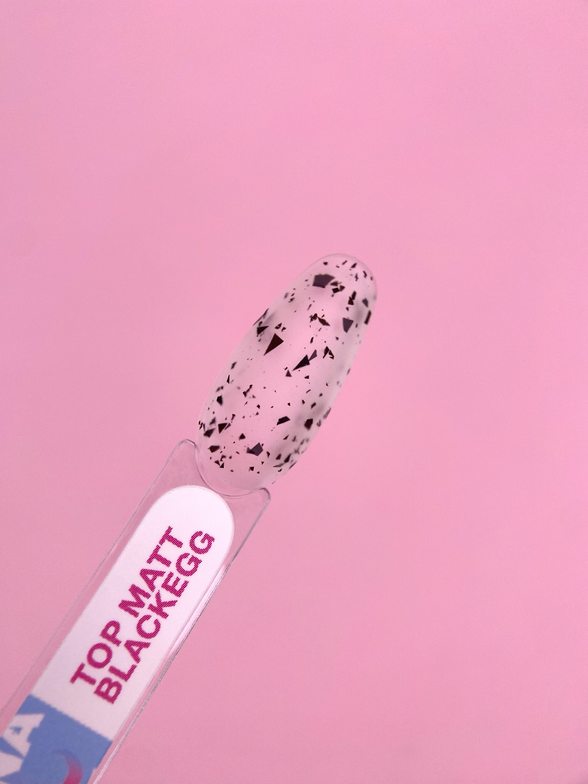 Top Matt Blackegg ist eine matte Platte mit dekorativen Elementen, ohne klebrige Schicht, die mit jeder Farbe auf den Nägeln harmonisch aussieht. Es ist in der Lage, Ihre Maniküre interessant und ungewöhnlich zu gestalten.