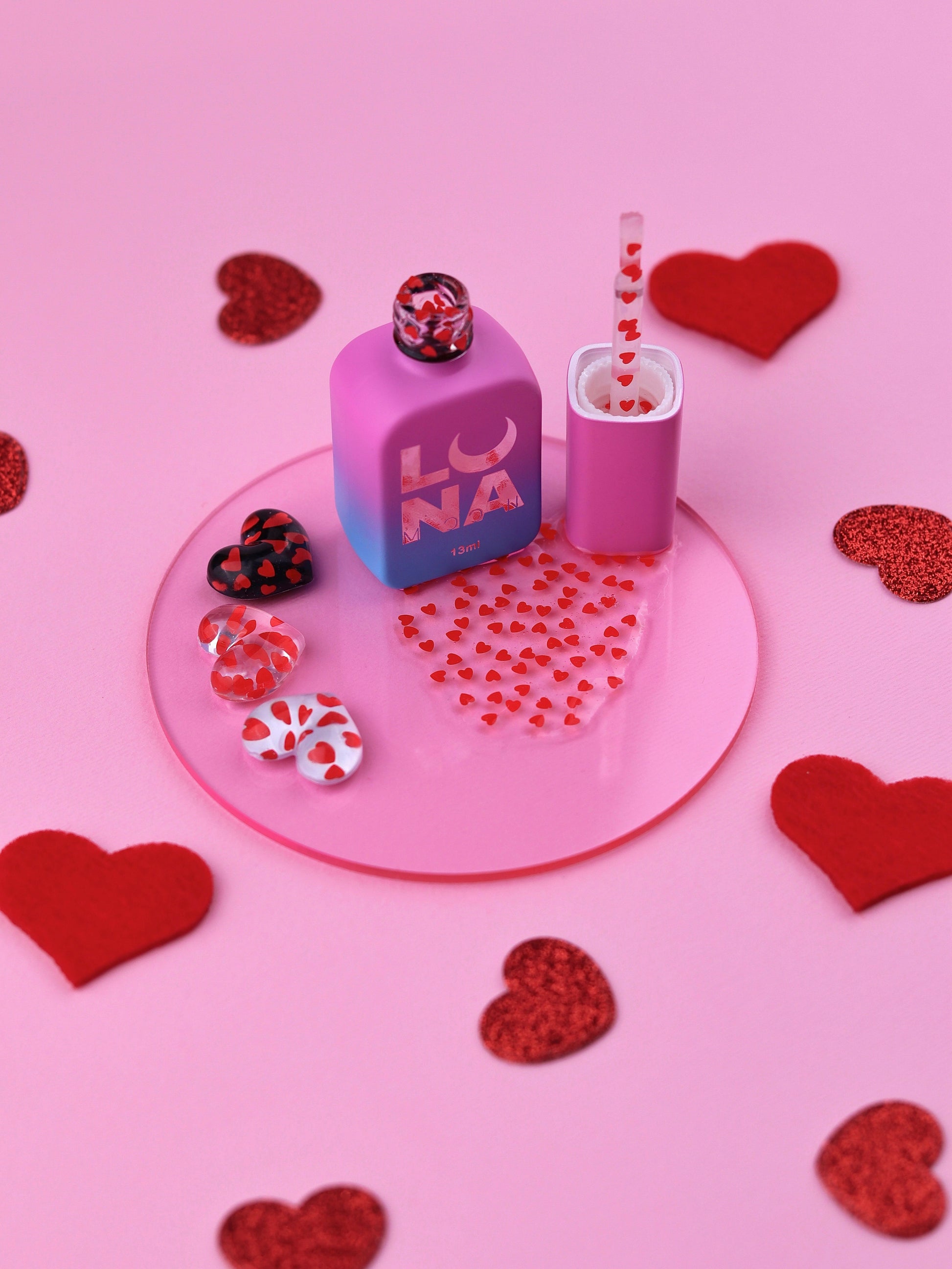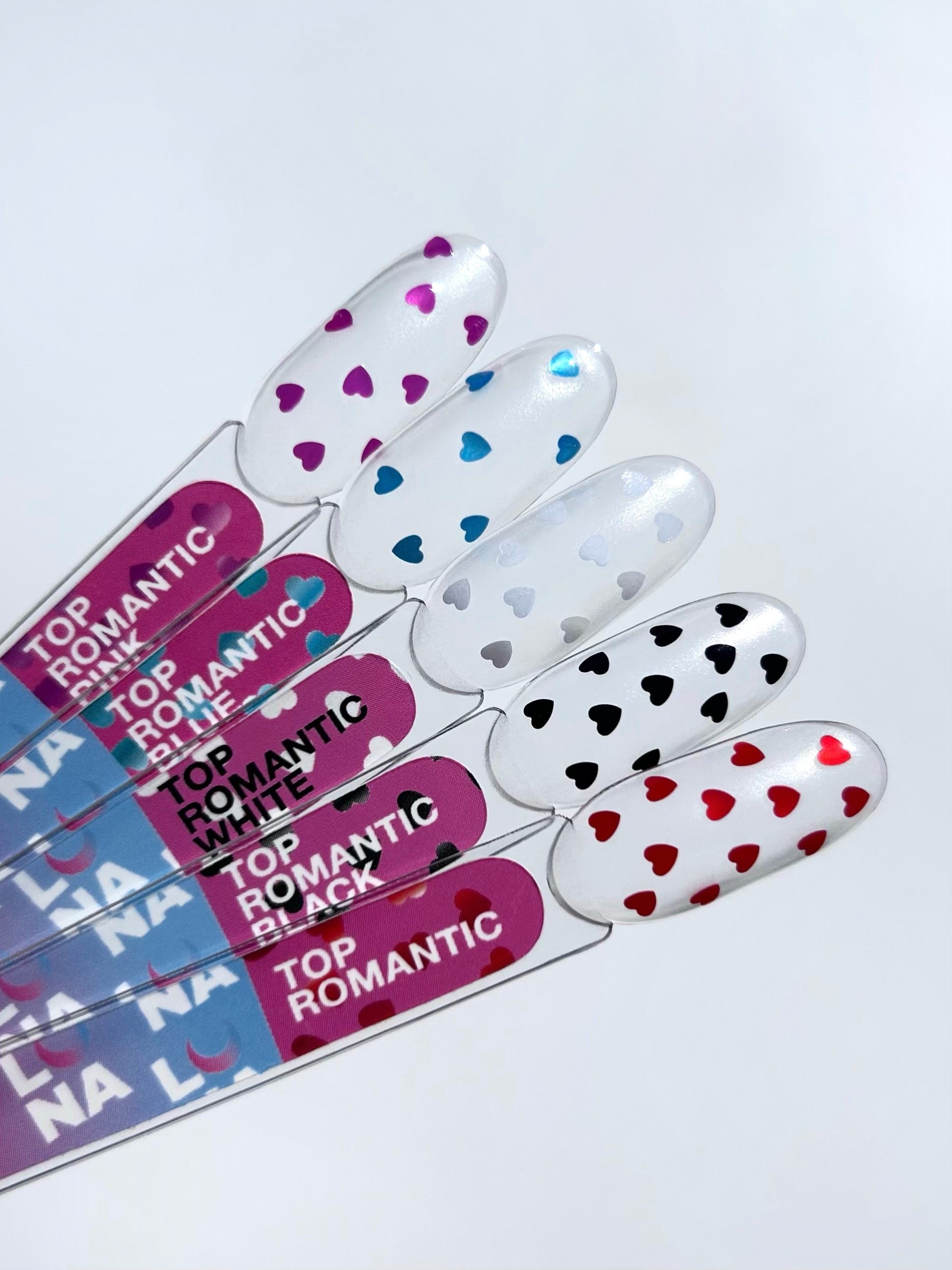Top Romantic ist ein Top mit Herzen, ohne klebrige Schicht, das mit jeder Farbe auf den Nägeln harmonisch aussieht. Es ist in der Lage, Ihre Maniküre interessant und ungewöhnlich zu gestalten.